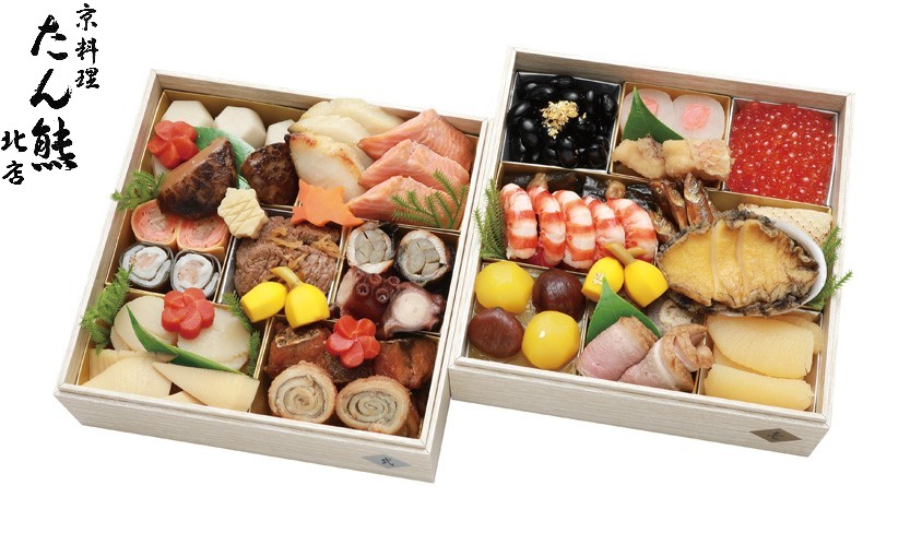 - [一段重]いくら醤油漬け,鮭砧巻,鯛南蛮漬け,丹波黒豆(金箔のせ),あわび旨煮,いか白焼き,ワカサギ飴煮,車海老艶煮,昆布巻,味付数の子,牛蒡月冠,合鴨オレンジ煮,きんとん,渋皮栗,栗甘露煮,六方くわい[二段重]銀だら西京焼、鮭西京焼,六方小芋煮,椎茸含め煮,鰻八幡巻,蛸柔らか煮,牛肉しぐれ煮,鮭錦糸巻,鯛龍飛巻,真鱈うま煮,穴子鳴門巻,貝柱白煮,竹の子煮,梅花人参,鶴人参、亀竹の子煮