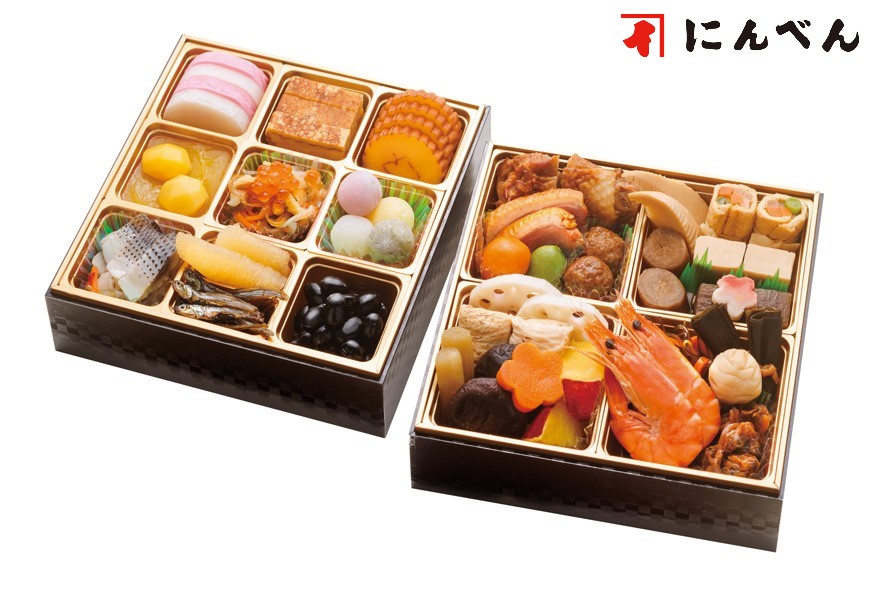- [一段重]紅白蒲鉾、厚焼玉子、伊達巻、栗きんとん、七福なます、味付いくら、ひとくち大福、田作り、味付数の子、こはだかぶら漬、丹波黒豆[二段重]鶏照焼、合鴨スモーク、若桃甘露煮、金柑甘露煮、肉団子甘辛煮、穂先たけのこ煮、信田巻煮、高野豆腐煮、こんにゃく煮、梅生麩煮、蓮根煮、焼湯葉巻煮、ごぼう煮、ふき煮、梅人参煮、椎茸煮、さつま芋レモン煮、松前漬、昆布巻、焼海老、くわい煮、あさりの佃煮