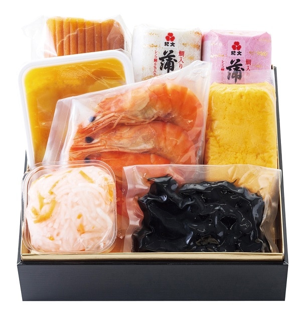[一段重]・蒲鉾(白)・蒲鉾(紅)・栗きんとん・味付数の子・祝海老・黒豆・伊達巻・田作り・錦玉子 [二段重]・ばい貝旨煮・紅白なます・数の子昆布菊花和え・昆布巻・あわび旨煮・厚焼玉子・煮しめ(梅型人参・ふき・ごぼう・高野豆腐)・ぶり照焼・豚角煮
