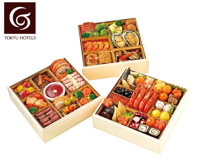 - 【一段重】サワラ西京焼、金柑甘露煮、かに真丈、味付数の子、牛肉のしぐれ煮、梅型ねじり人参煮、金箔黒豆煮、味付いくら、海老旨煮、切干大根煮、てまり餅、栗きんとん、しいたけ煮、筍煮、山くらげ菊花、たこ梅酢和え、なます、鯛龍皮巻【二段重】ラタトゥイユ、黒毛和牛のビーフシチュー、鶏ワイン焼、人参のオレンジマリネ、ブロッコリーグリル、銀鮭のエスカベッシュ、ドライトマトのオイル漬け、ポークリエット チーズムース 赤ワインジュレ、スモークローストポーク トンナートソース添え、ローストビーフ ビーンズデミグラスソース煮添え、スタッフドオリーブ、合鴨スモーク、キノコとパプリカのマリネ、スモークサーモントラウト、彩り野菜のバーニャカウダソースマリネ【三段重】蜜汁叉焼、若桃甘露煮、ブロッコリーグリル、青ザーサイ、肉団子、海老チリソース、鮑のオイスターソース煮、きくらげ煮、中華くらげ、鶏三色巻、黒酢酢豚