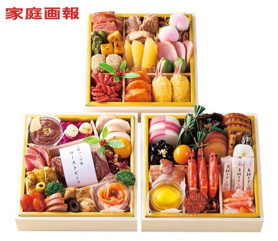 - 初代の家庭画報オリジナルおせちとして誕生してから十余年。ロングセラーとして愛されてきた「三段おせち」は、品数豊富で量もたっぷり。伝統的なおせちがメインの和風の一の重、肉料理など華やかな洋風料理が並ぶ二の重、旨みを利かせた中国テイストの品々を詰めた三の重と、多彩な味わいで食べ飽きません。新年の集いに、にぎやかに囲みたい三段重です。