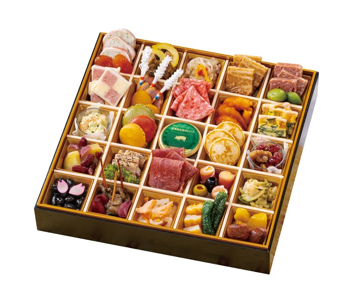 - 【一段重】貝柱ムースのベーコン巻、ドライトマトのワイン煮、鶏の炭火焼き、柚子皮甘煮、チキンの瀬戸内レモンマスタードマリネ、 豚の角煮、チーズと香草入りミートローフ、若桃のシロップ漬け、市松チーズホワイトオードブル、合鴨スモーク、杏子白ワイン煮、ボロニアソーセージ、海老のチリソース、かぼちゃのキッシュ、海老バジルソース、ガトーマカロン抹茶、ガトーマカロンフランボワーズ、ガトーマカロンレモン、北海道産豚のリエット、ミニブリニサレ、クランベリーとクルミのシロップ煮、さつまいもとリンゴのレモン煮、ベーコンパストラミ、ブロッコリーコンソメ煮、パストラミビーフ、生ハムチーズロール、ブラックオリーブ塩漬け、スタッフドオリーブ塩漬け、ザーサイとくらげの中華味仕立て、花びら百合根餡、黒豆煮、あかにし貝スモーク味、 らっきょうワイン漬け、大根と玉葱のサーモンマリネ、いか鹿の子焼き、胡瓜の柚子風味マリネ、紅あずま蜜煮、渋皮栗甘露煮