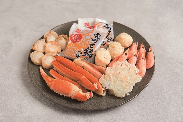 秋鮭切身60g×6、ボイル甘えび×6尾、ボイル帆立×6、つまみ揚げ(カニ風味)×3、味噌鍋のタレ50g×2