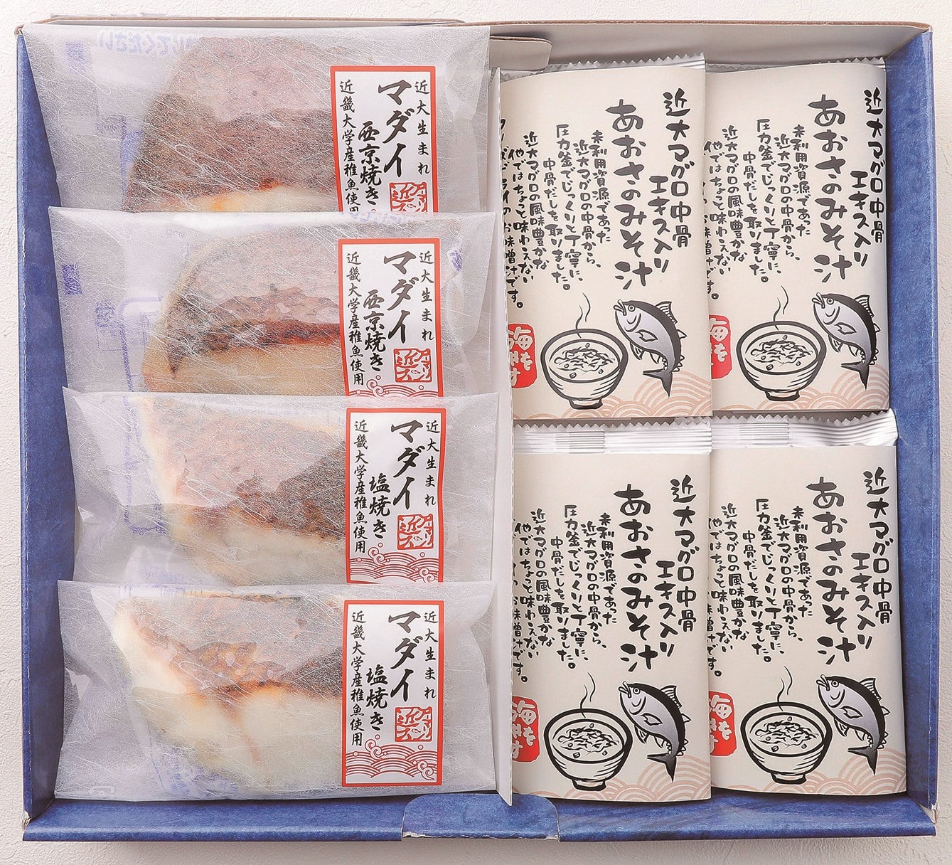 近大生まれマダイの塩焼き1切れ・近大生まれマダイの西京焼き1切れ×各2、近大マグロ中骨エキスりあおさのみそ汁(フリーズドライ)1個×4