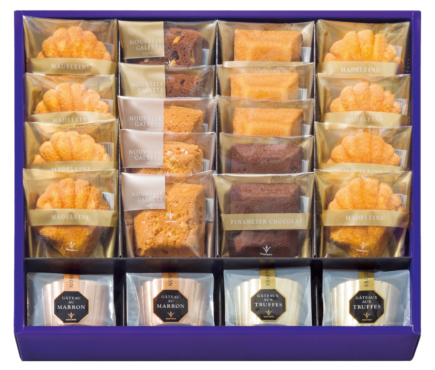 トリュフケーキ・ガトーオマロン×各2、マドレーヌ×8、フィナンシェ×3、フィナンシェショコラ×2、ヌーヴェルガレット(バニラ)×3、ヌーヴェルガレット(チョコ)×2