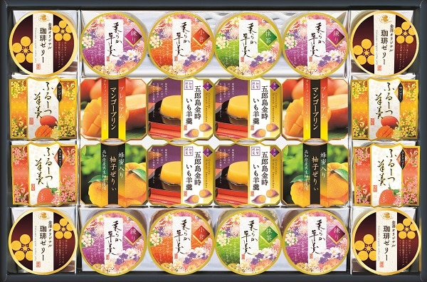 五郎島金時いも羊羹80g×4、プレミアムマンゴープリン75g×2、蜂蜜入り柚子ぜりぃ75g×2、金澤オリジナル珈琲ゼリー52g×4、柔らか羊羹練り60g×4、柔らか羊羹抹茶60g×2、柔らか羊羹小倉60g×2、ふるーつ羊羹ストロベリー60g×2、ふるーつ羊羹マンゴー60g×2