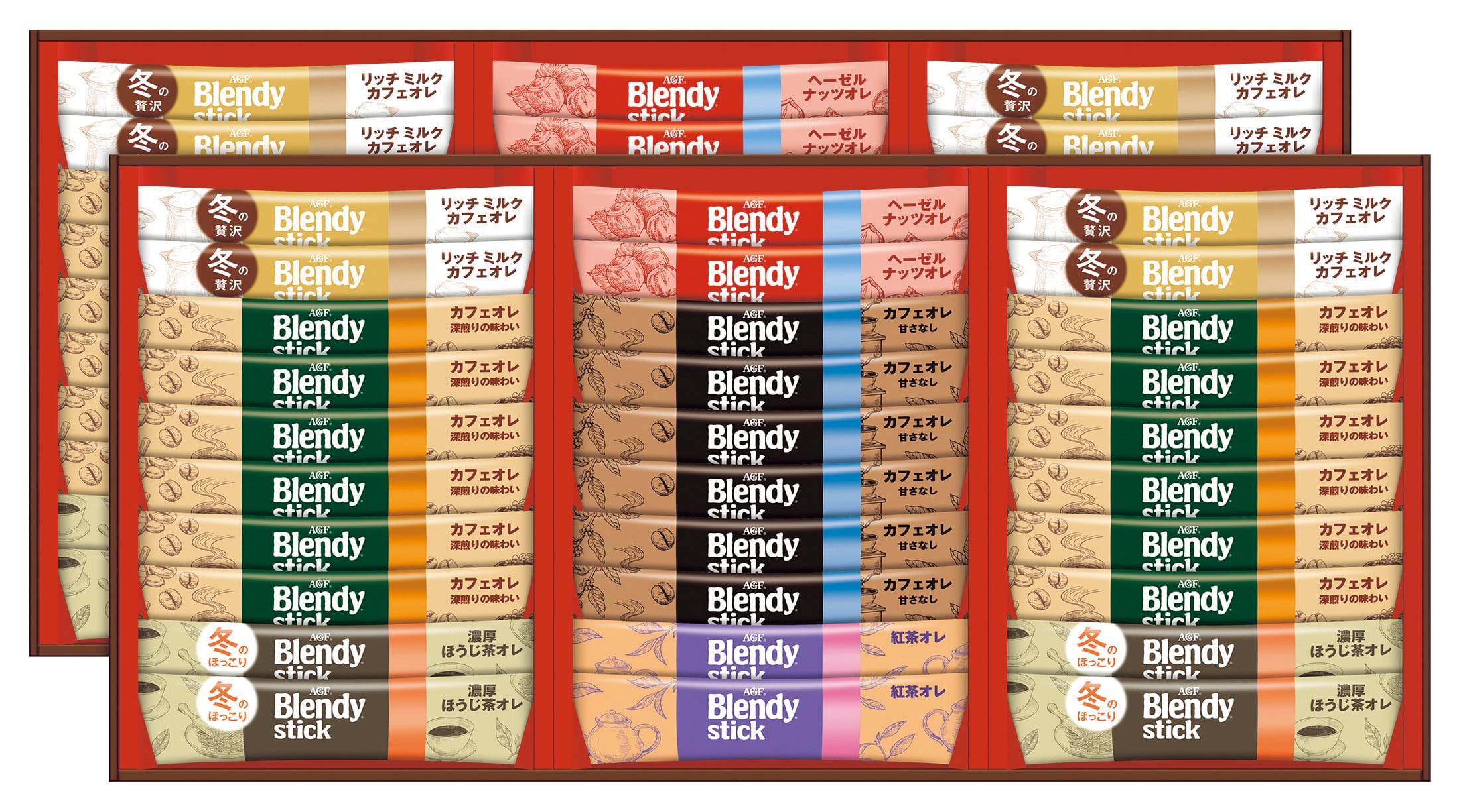 ブレンディスティック(カフェオレ14g×24、甘さなし11.4g×12、紅茶オレ11g×4、ヘーゼルナッツオレ11g×4、リッチミルクカフェオレ8.9g・濃厚ほうじ茶オレ11.7g×各8)