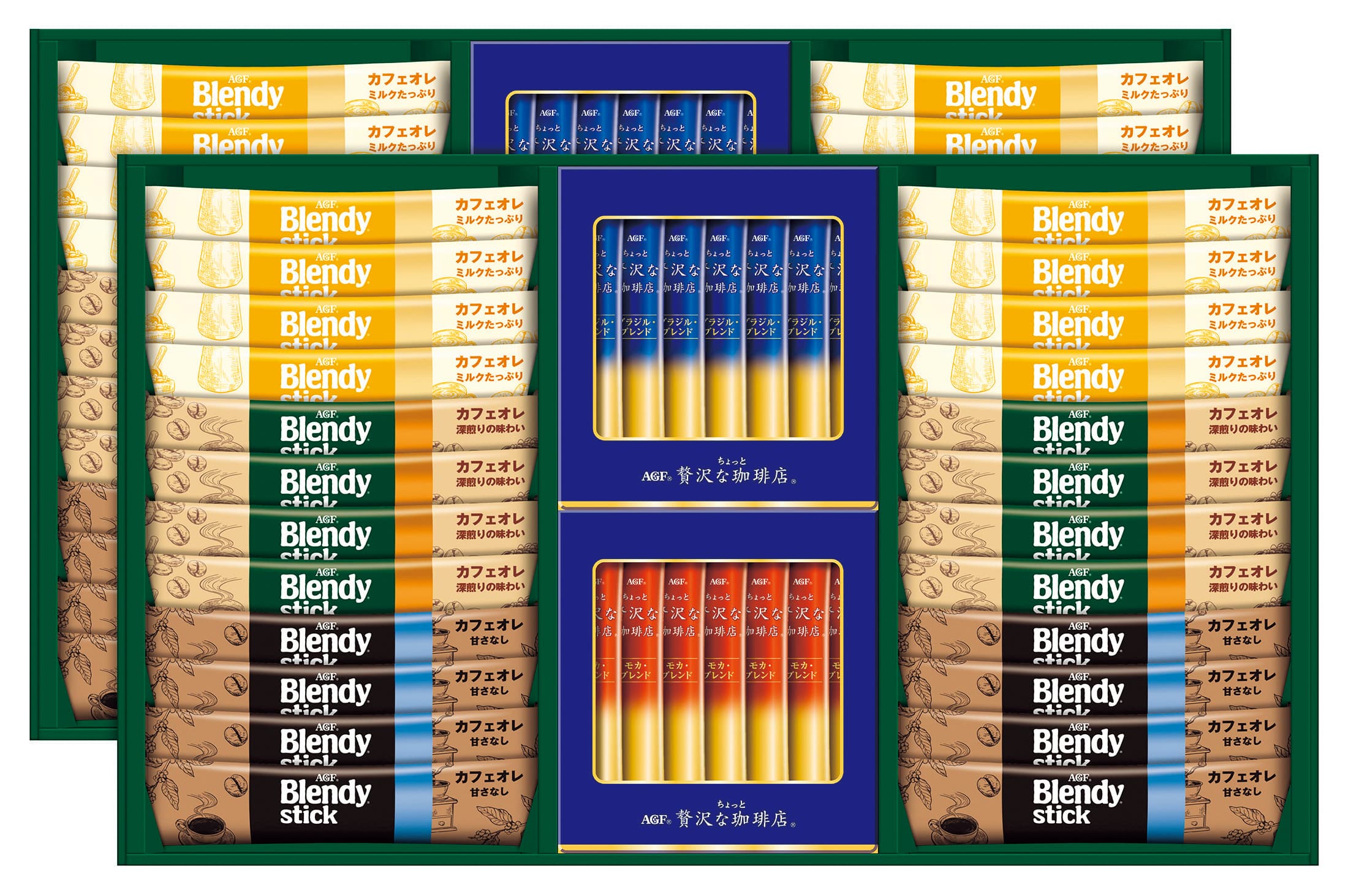 ブレンディスティック(カフェオレ14g・ミルクたっぷり14g・甘さなし11.4g×各16)、ちょっと贅沢な珈琲店スティックブラック(ブラジルブレンド、モカブレンド各2g×14)