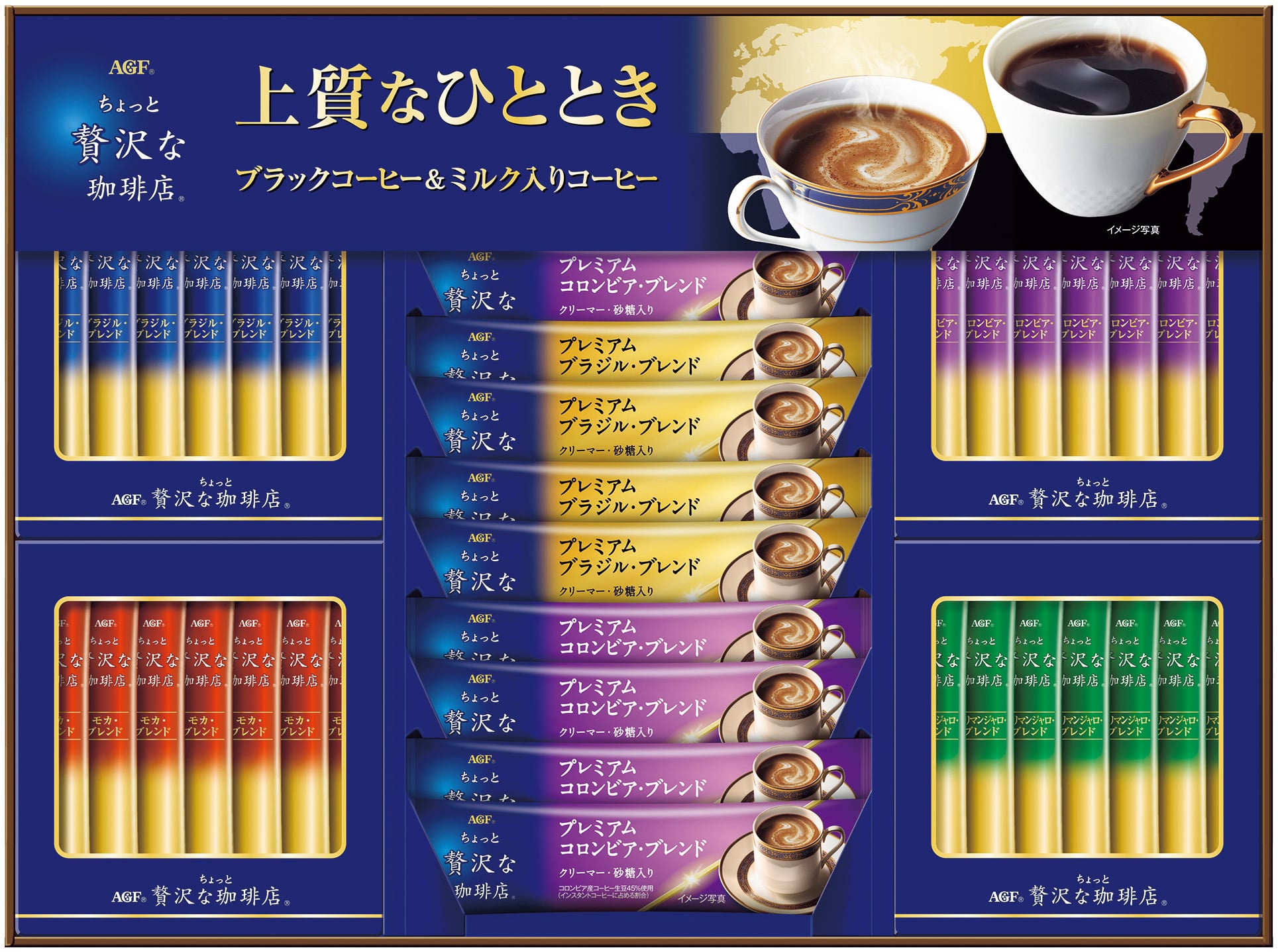 ちょっと贅沢な珈琲店スティックブラック(ブラジルブレンド・コロンビアブレンド・キリマンジャロブレンド・モカブレンド各2g×7)、ちょっと贅沢な珈琲店スティックコーヒー(プレミアムブラジルブレンド・プレミアムコロンビアブレンド各7g×6)