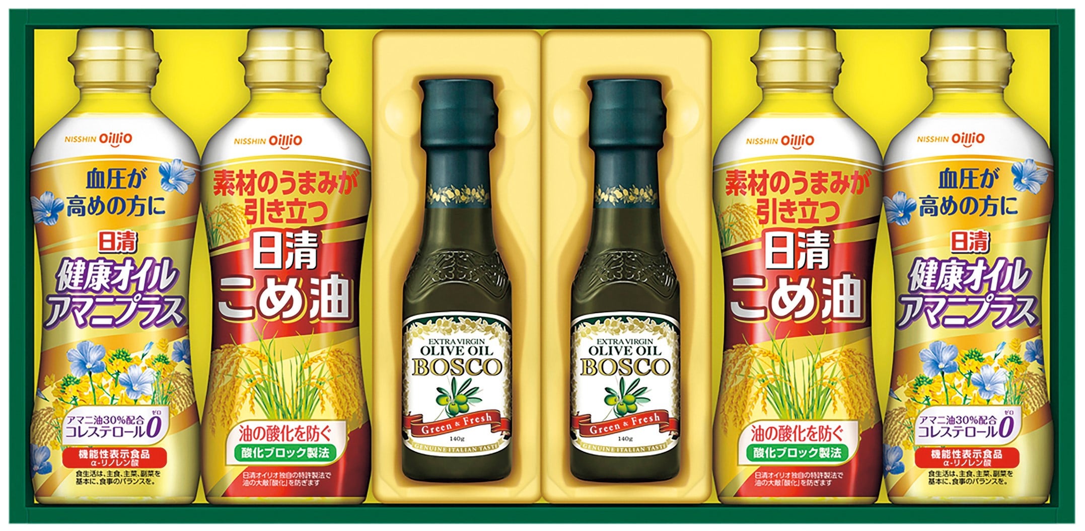 豊かな香りと味わいのBOSCOオリーブオイルと日清健康オイルアマニプラス、日清こめ油を詰め合わせたギフト。