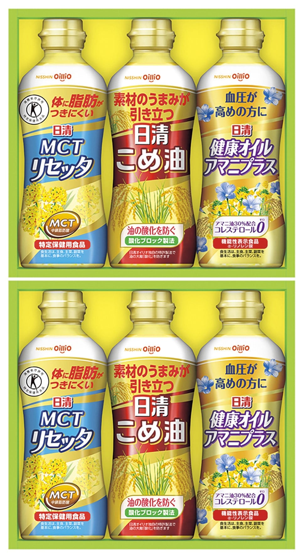 素材のうまみを引き立てる「日清こめ油」、体に脂肪がつきにくい特定保健用食品「MCTリセッタ」、そして血圧が高めの方におすすめの「日清健康オイルアマニプラス」を詰め合わせました。おいしさと健康を考えた、人気のギフトです。