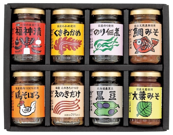 元祖福神漬90g・くきわかめ75g・のり佃煮95g・鯛みそ100g・鶏そぼろ50g・えのきだけ90g・黒豆100g・大葉みそ100g