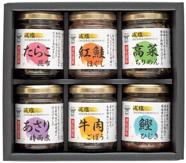 減塩 牛肉ごぼう60g・減塩 紅鮭ほぐし80g・減塩 高菜ちりめん80g・減塩 あさり時雨煮65g・減塩 たらこ昆布55g・減塩 鰹ひじき50g