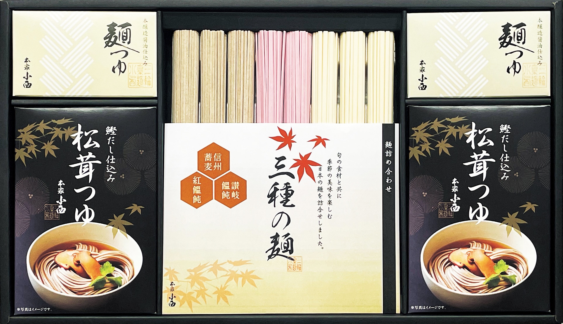 うどんやそばに、麺つゆと具材のはいった松茸つゆを詰め合わせました。