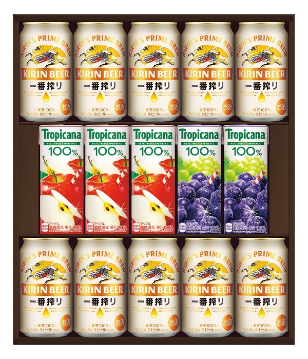 キリン一番搾り生ビール350ml×10、トロピカーナ 100% アップル 250ml×3、トロピカーナ 100% グレープ 250ml×2