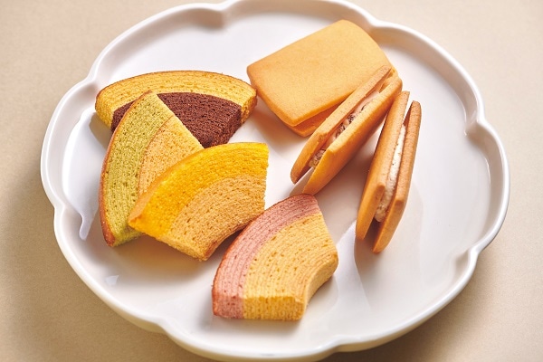 一層一層丁寧に焼き上げた生地と、果汁を加えて仕上げた生地の2つの味が絶妙なハーモニーの「フルーツクーヘン」。なめらかで口当たりのやさしいフルーツクリームと香り豊かな果肉を香ばしいクッキーでサンドした「フルーツサンド」の詰合せです。