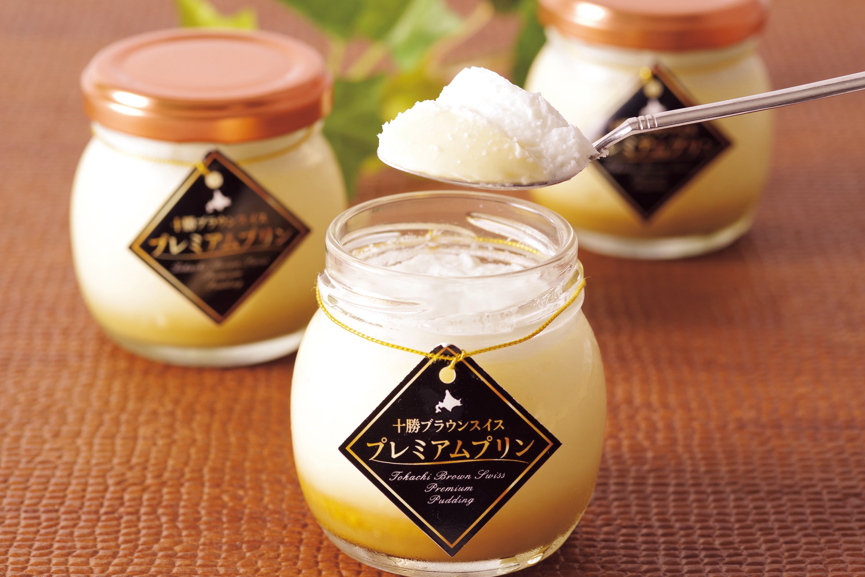 十勝橋本牧場の希少なブラウンスイス牛の生乳を使用したプリンに、上はクリーム、下はカラメルソースを入れました。
