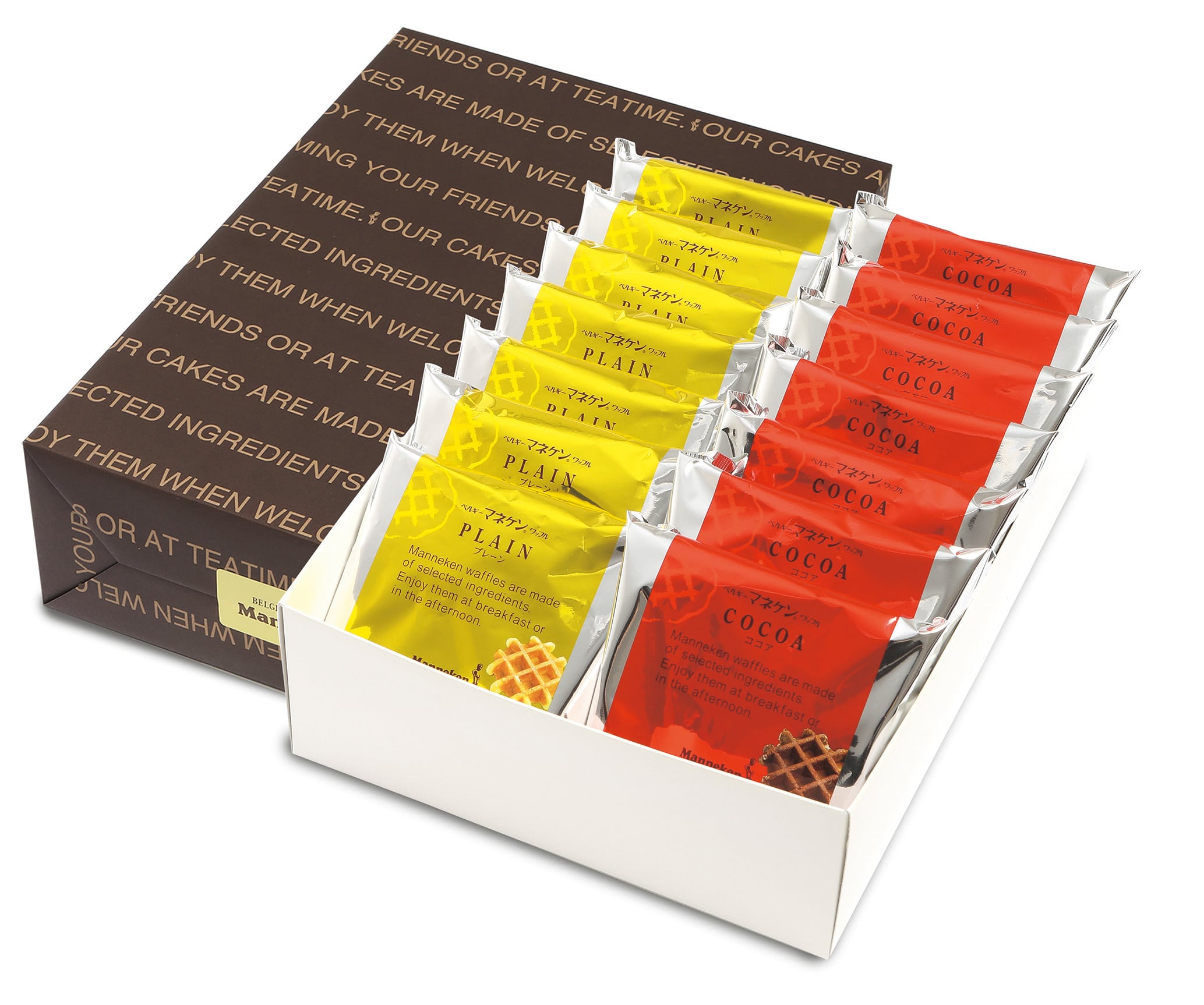 ベルギー産パールシュガーを始め厳選した食材を使って焼き上げ、マネケンならではの独特の食感と風味に仕上げました。プレーンとココアの2つの味を詰め合わせました。