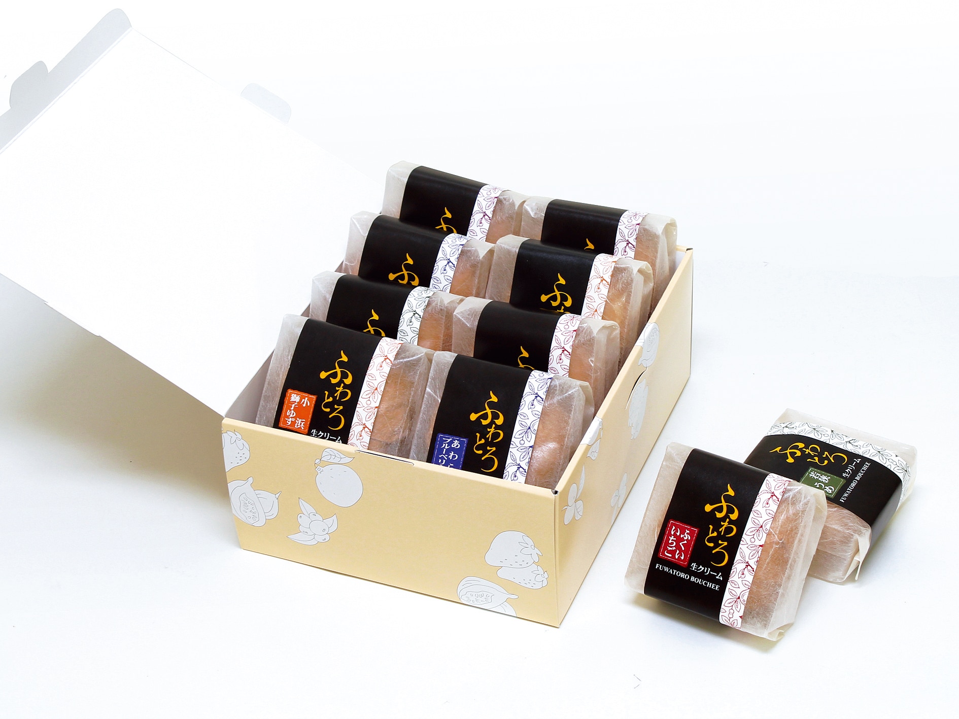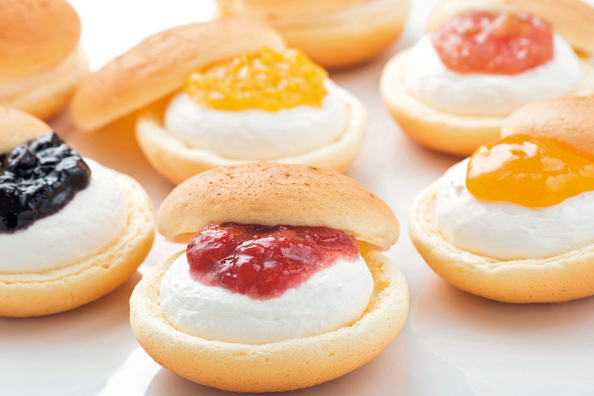 チーズ風味のふんわり生地に甘さ控えめの生クリームと福井産の果物コンフィチュールをサンド。5つの味でご用意しました。