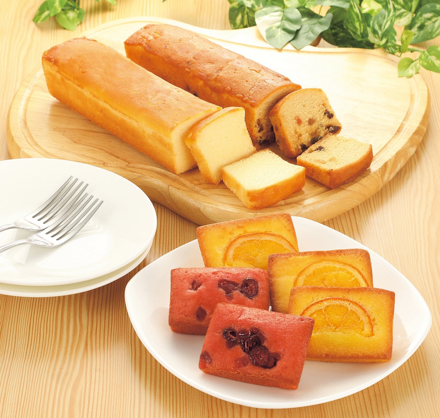 チーズパウンドケーキ1本(長さ約19cm)、フルーツパウンドケーキ1本(長さ約19cm)、オレンジケーキ3個(1個約7cm×5.5cm)、フランボワーズケーキ2個(約7cm×5.5cm)