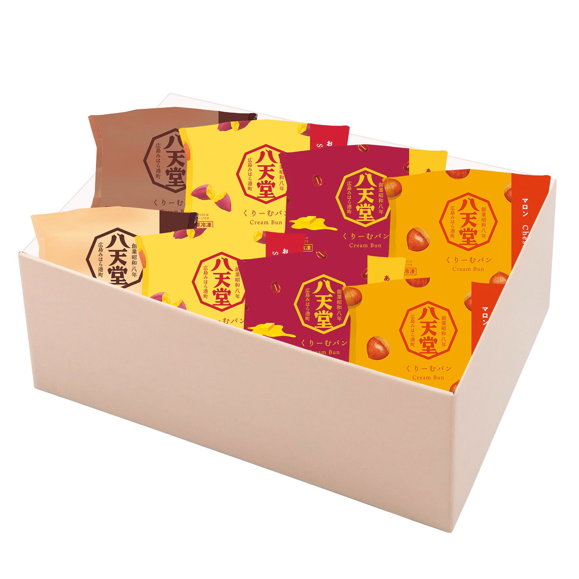 八天堂定番のくりーむパンに加えて、この季節限定の『マロン』『あんバター』『おいも&カスタード』を詰合せました。季節限定のフレーバーをぜひご堪能ください。