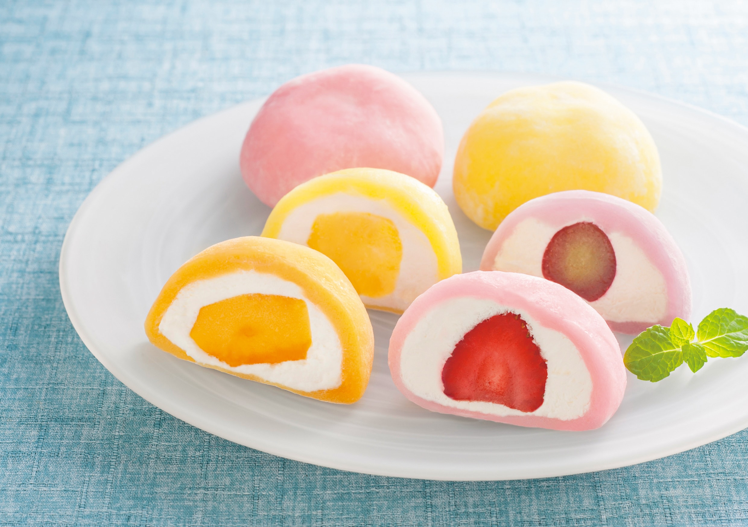 みずみずしいフルーツの果肉とクリームを柔らかなお餅で閉じ込めたカラフルなフルーツ大福です。