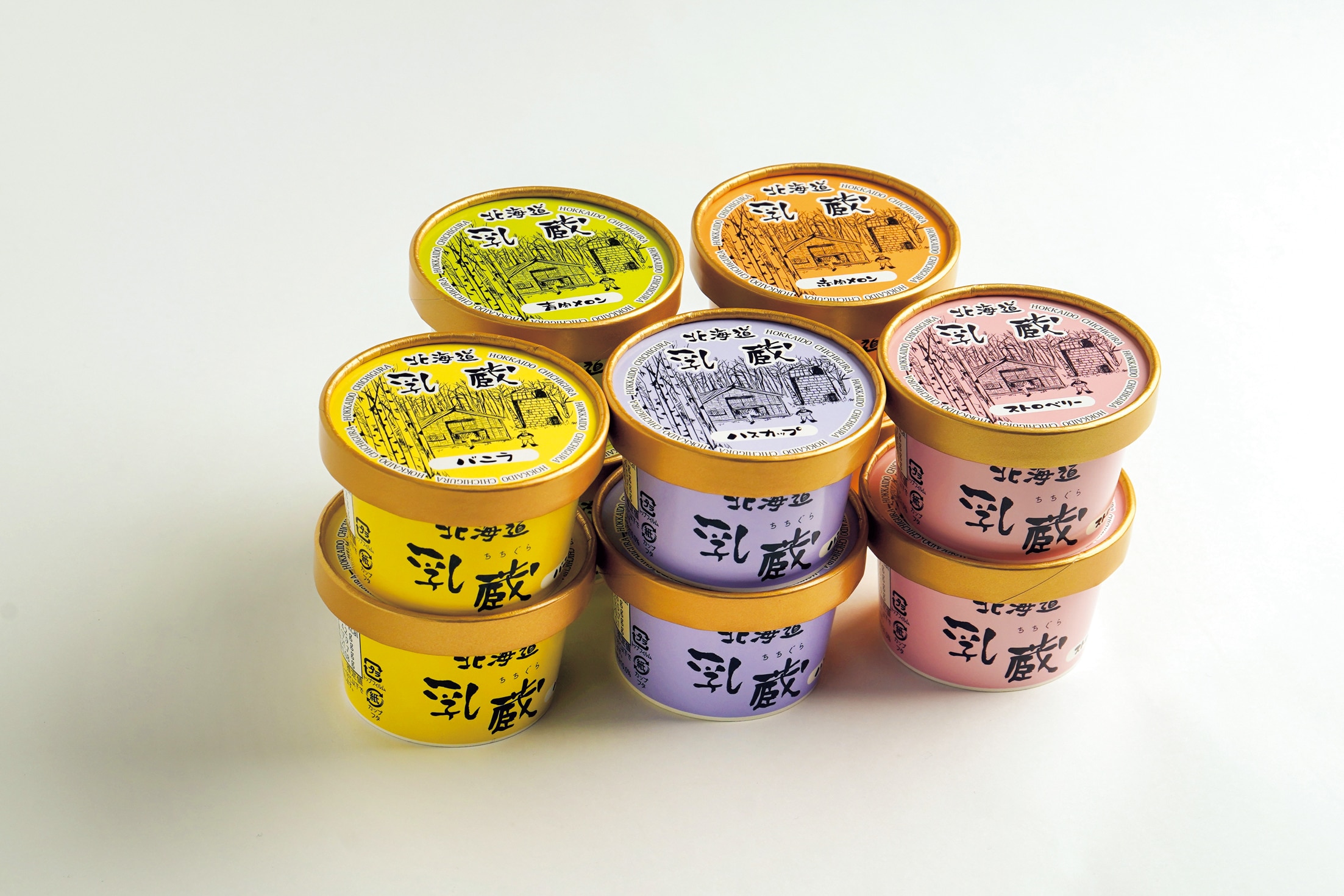 北海道牛乳を使用したアイスセット。人気のバニラに赤肉・青肉メロンやハスカップ、ストロベリーの4種のフルーツの味も楽しめます。