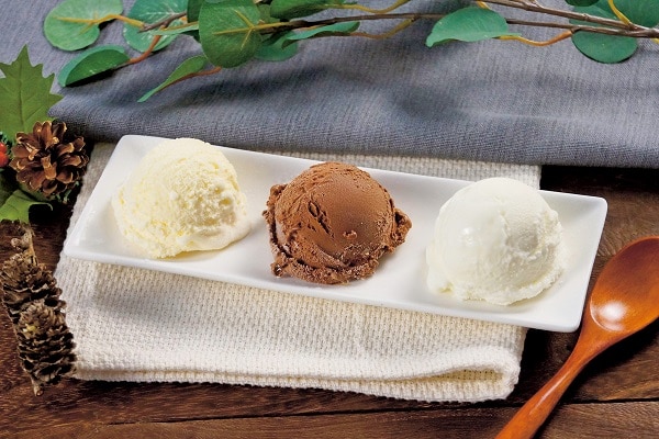 北海道産牛乳を使用した濃厚なプレミアムバニラ。チーズの程よい酸味を活かしたクリームチーズ、ちょっぴりビターなチョコの3種類のセット。