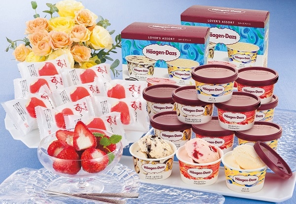 苺アイスとハーゲンダッツで人気のフレーバー3種類が入った”ラバーズアソート”をセットにしてお届け。