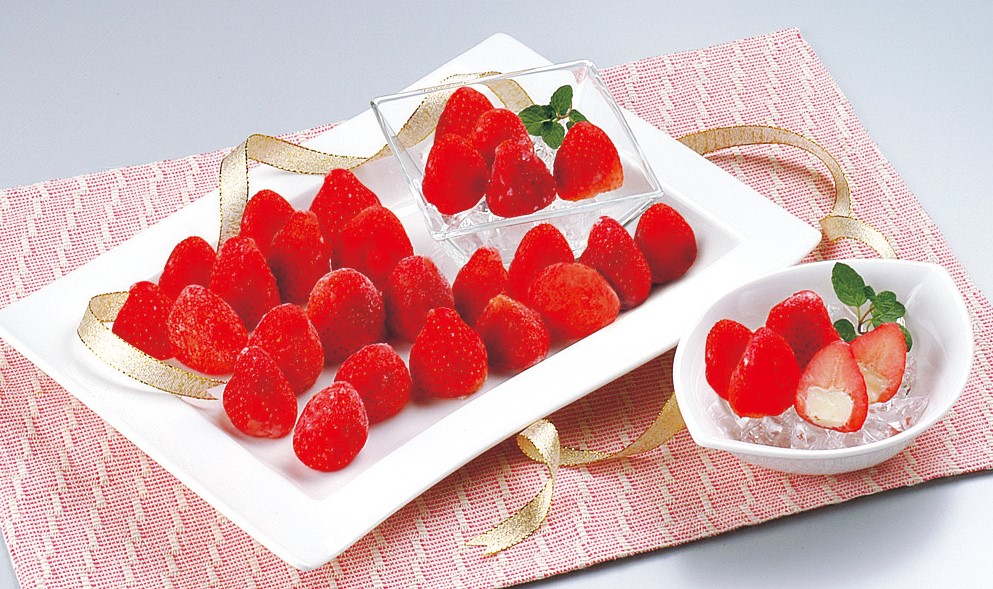 新鮮な苺の芯を丁寧にくり抜いて相性抜群の練乳と生クリームのアイスクリームをしぼり入れました。