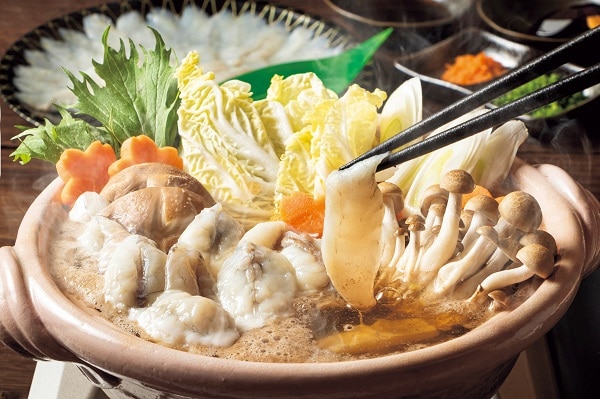鮮度の良い真ふぐを手早く捌き、しゃぶしゃぶ用の切身とちり鍋用の切身に仕上げ、お皿に盛り付けました。真ふぐの2つの食感を贅沢に味わって頂ける海鮮鍋です。寒い冬に季節のお野菜と一緒にご家族でどうぞ。