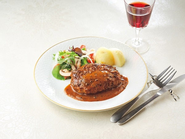 後藤祐輔氏監修のハンバーグセット。牛肉100%の柔らかなハンバーグに、黒トリュフを使用した贅沢なデミグラスソースを合わせました。レンジで簡単調理ができ、時間のない時でもレストランの味が楽しめます。
