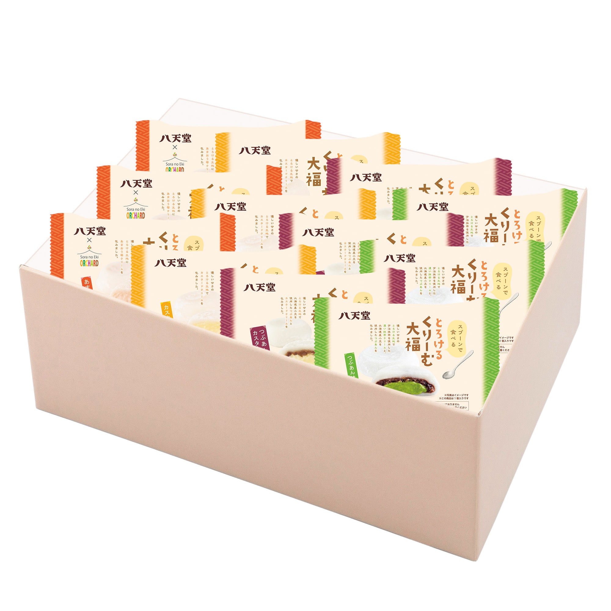 くちどけにこだわった「とろけるくりーむ大福」。手で持って食べることができないほど柔らかいとろける生地で、八天堂のクリームを包み込みました。冷たいままでもくちどけの良い“スプーンで食べる”大福です。カスタード、つぶあんカスタード、あまおう苺、つぶあん抹茶の4種のお味が楽しめます。