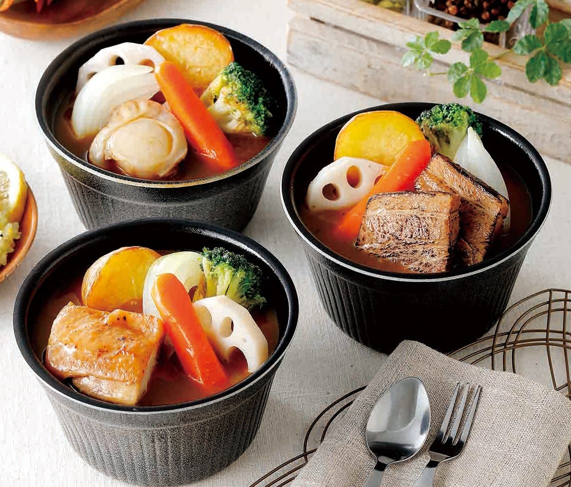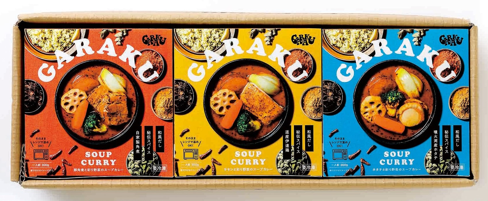 チキンと彩り野菜のスープカレー300g・豚角煮と彩り野菜のスープカレー300g・ホタテと彩り野菜のスープカレー300g×各1