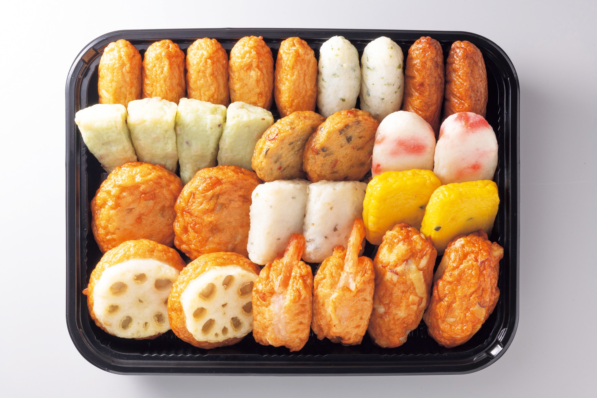 魚肉をブレンドし旨味を引き出し、ソフトな食感には豆腐と山芋、風味豊かな甘みに欠かせない灰持酒を使用。小田口屋独自の製造法です。又、練り物に相性の良い色鮮やかな種ものを用い、バラエティ豊かに仕上げました。