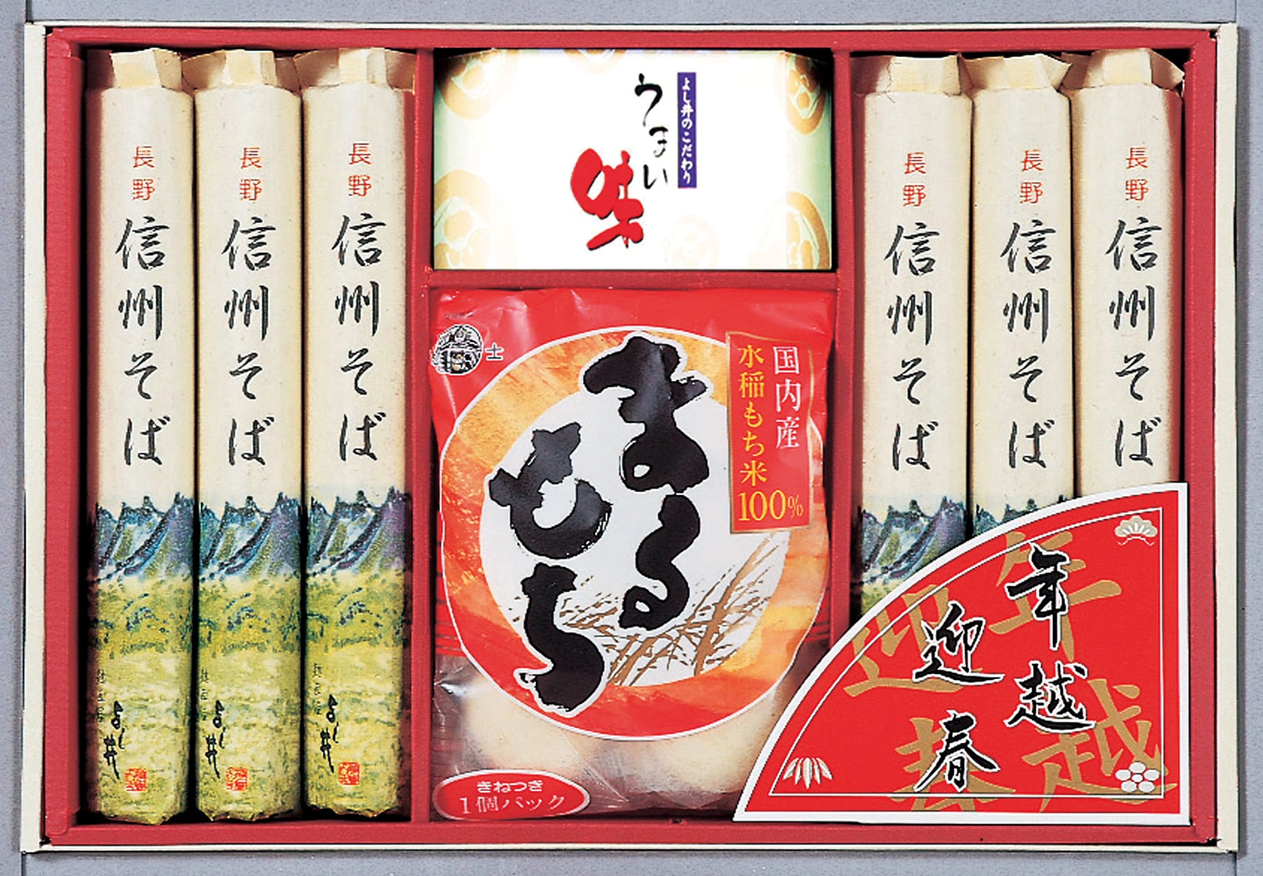 信州産の年越しそばに迎春用の杵つきもちをセットにしました。