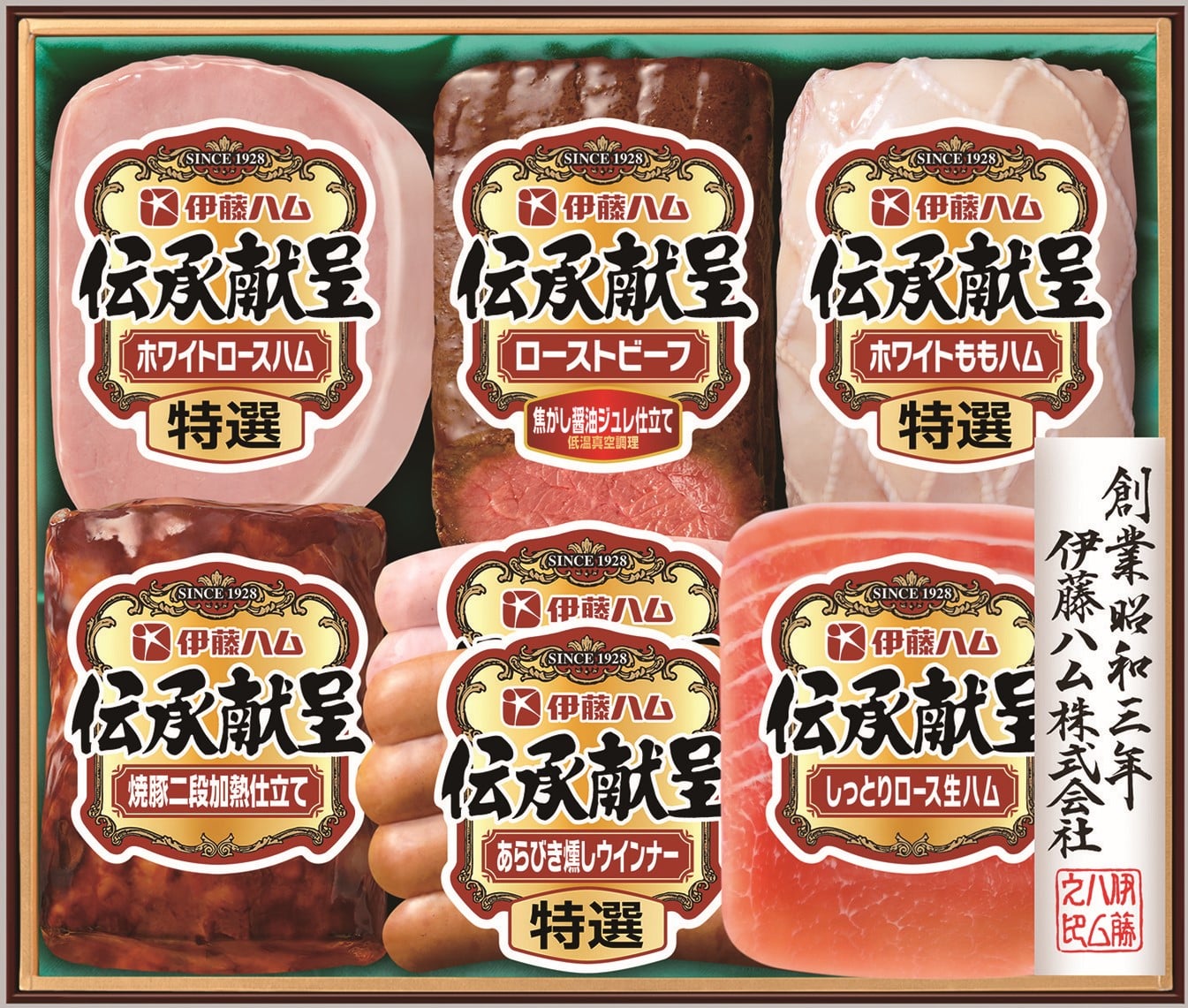 特選ホワイトロースハム180g、低温真空調理ローストビーフ焦がし醤油ジュレ仕立て180g、特選ホワイトももハム220g、焼豚二段加熱仕立て160g、特選あらびき芳醇ウインナー80g、特選あらびき燻しウインナー80g、しっとりロース生ハム45g