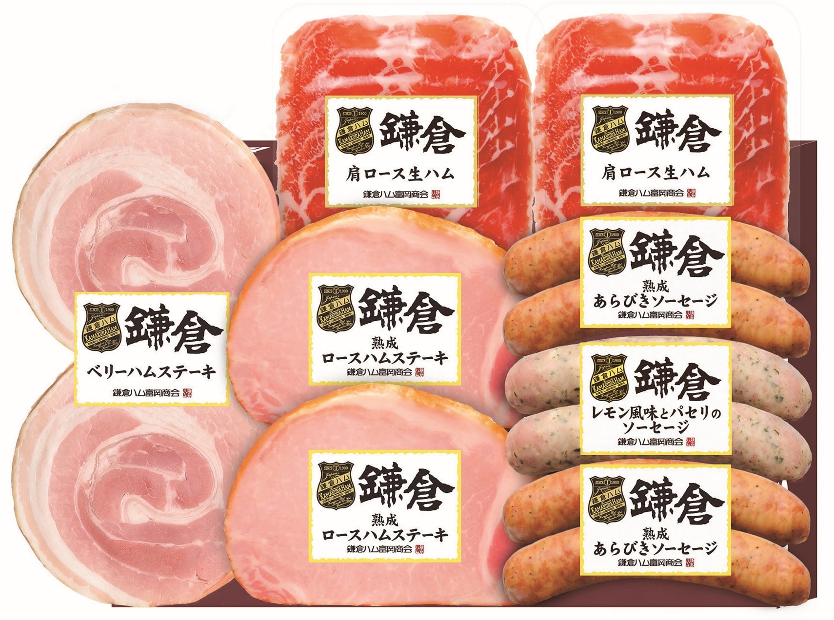 ベリーハムステーキ100g、肩ロース生ハム50g×2、熟成ロースハムステーキ63g×2、熟成あらびきソーセージ80g×2、レモン風味とパセリのソーセージ80g
