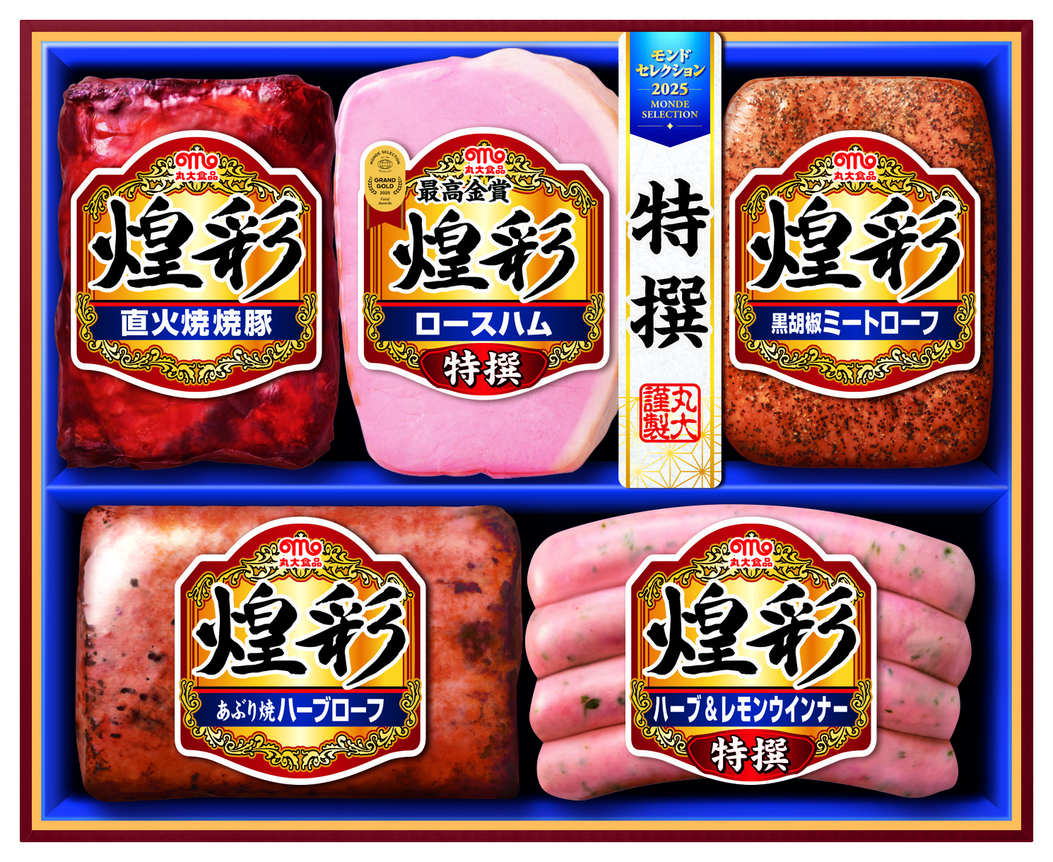 特撰ロースハム180g、直火焼焼豚170g、黒胡椒ミートローフ160g、あぶり焼ハーブローフ170g、特撰ハーブ&レモンウインナー80g