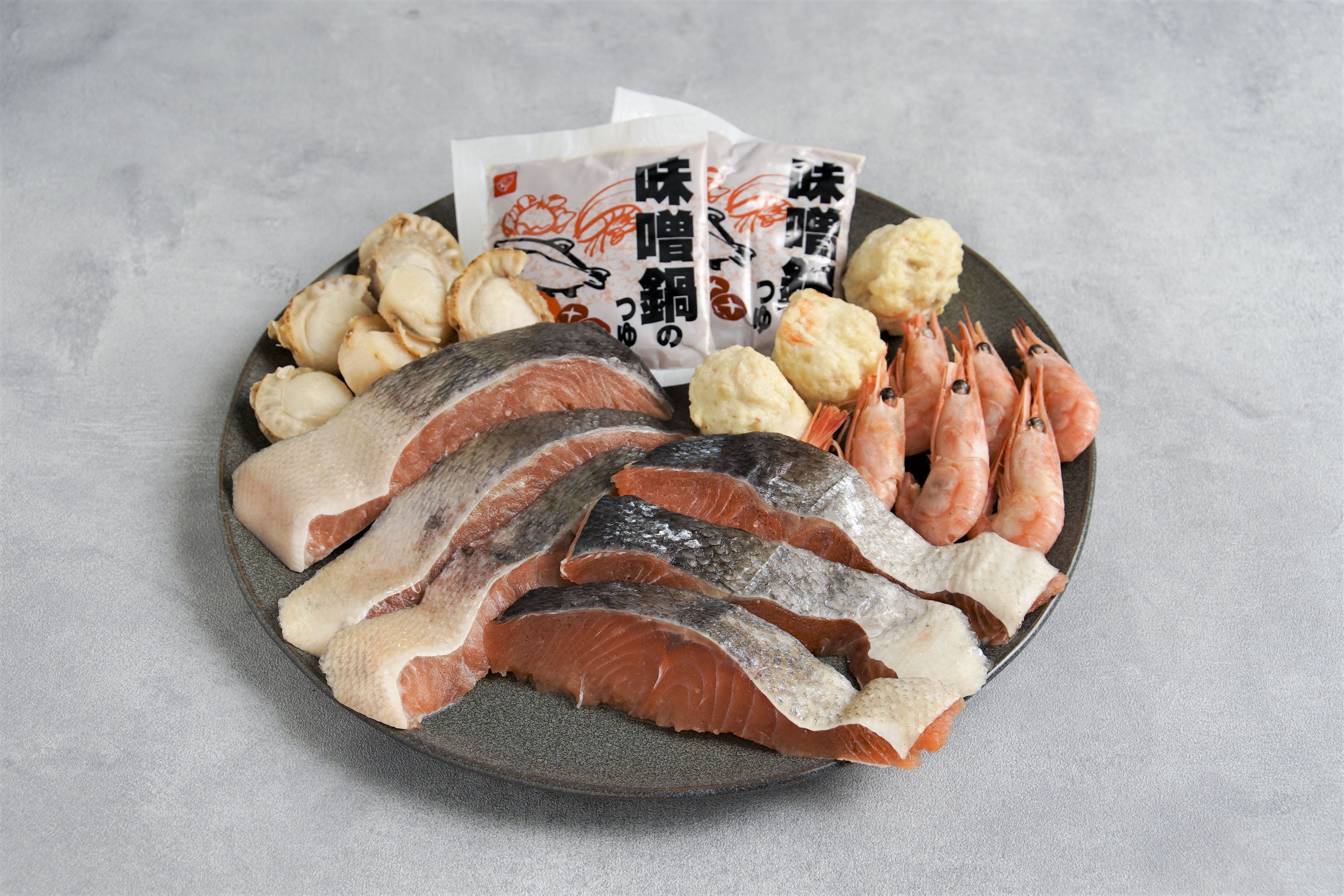 秋鮭切身60g×6、ボイル甘えび×6尾、ボイル帆立×6、つまみ揚げ(カニ風味)×3、味噌鍋のタレ50g×2