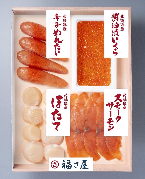明太子 150g、醤油いくら 60g、ほたて 150g、スモークサーモン 50g×2袋