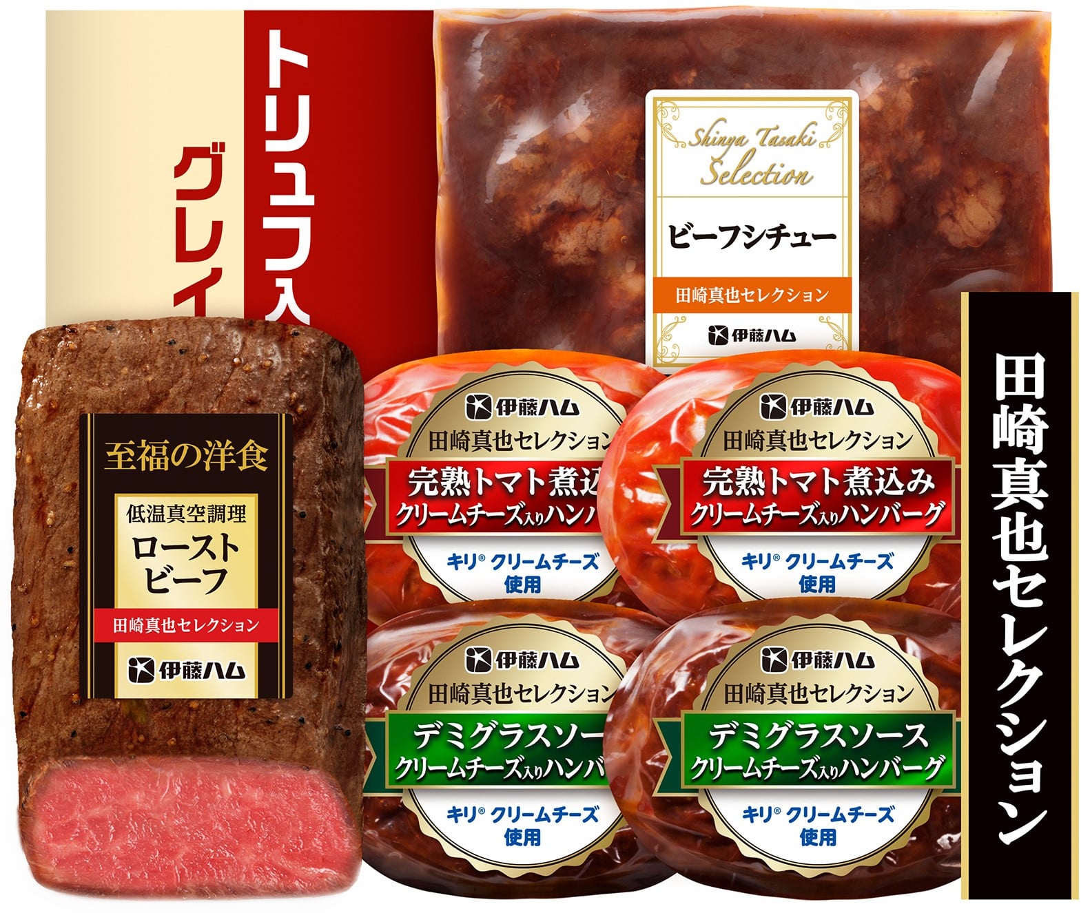 低温真空調理ローストビーフ200g、トリュフ入りグレイビーソース30g、ビーフシチュー180g、完熟トマト煮込みクリームチーズ入りハンバーグ77g×2、デミグラスソースクリームチーズ入りハンバーグ77g×2