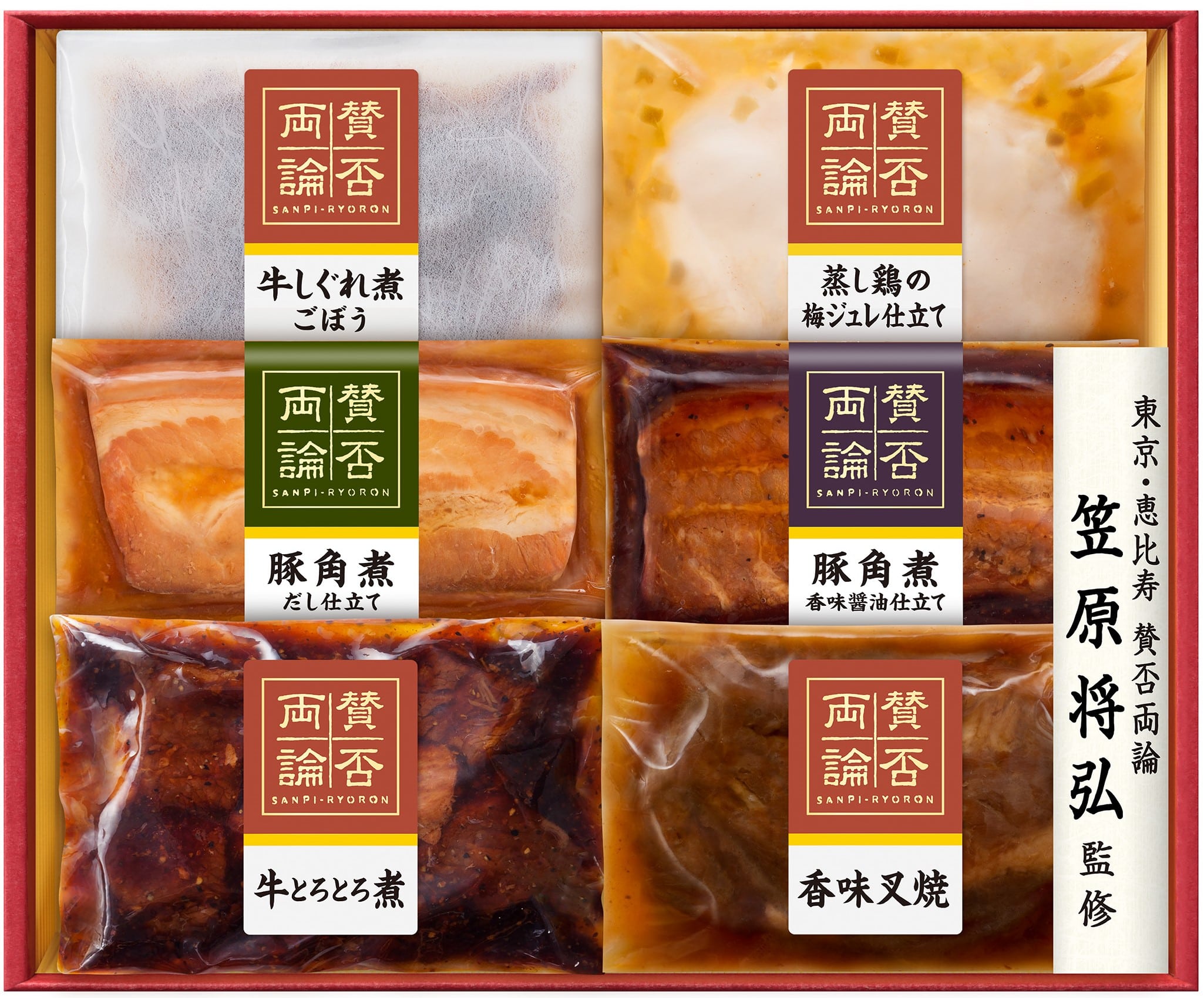 牛しぐれ煮ごぼう55g、蒸し鶏の梅ジュレ仕立て150g、豚角煮だし仕立て130g、豚角煮香味醤油仕立て130g、牛とろとろ煮150g、香味叉焼180g