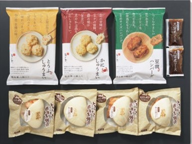 とうふしゅうまい32g×5、かにしゅうまい34g×5、豆腐ハンバーグ55g×5〈ソース付30g×2)、豚角煮まんじゅう70g×4〈賞味期限:冷凍300日〉