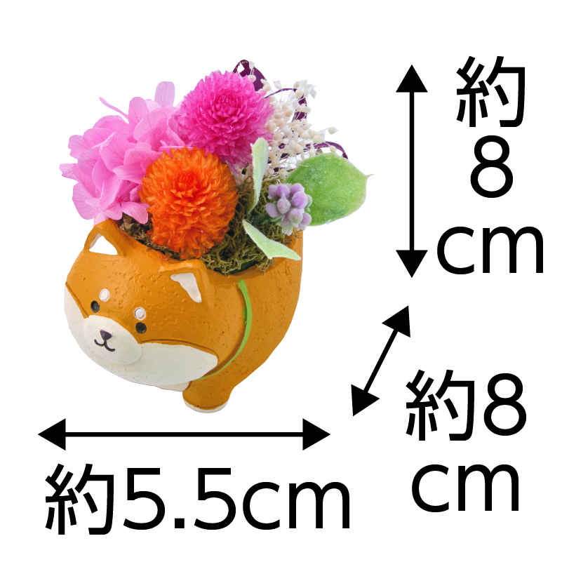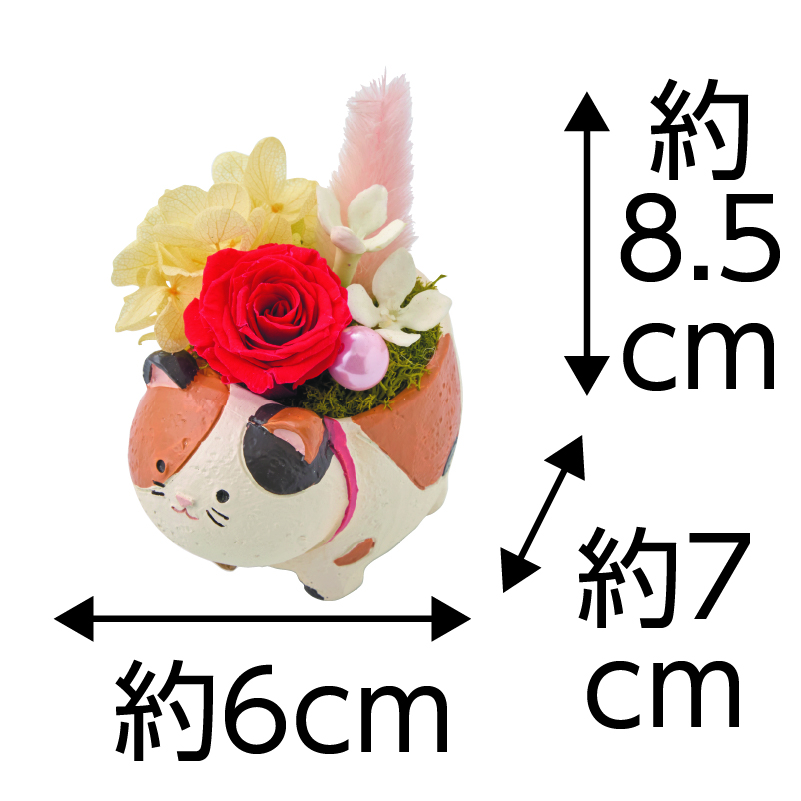 - ■三毛猫(プリザーブドフラワー(バラ・アジサイ)、造花、樹脂製器)、柴犬(プリザーブドフラワー(千日紅・アジサイ・カスミソウ)、造花、樹脂製器)、お手入れのしおり、銀座フルーツサンド(マスカットレーズン・いちご・柚子)×各2