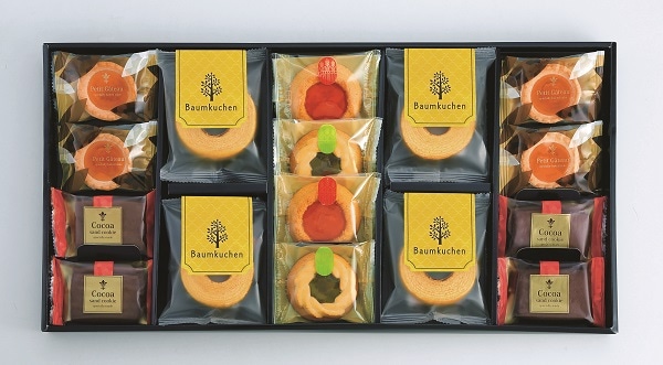 ■バウムクーヘン×4、ロシアケーキ(キウイ)×2、ロシアケーキ(ストロベリー)×2、プチガトー(オレンジ)×4、サンドクッキー(ココア)×4